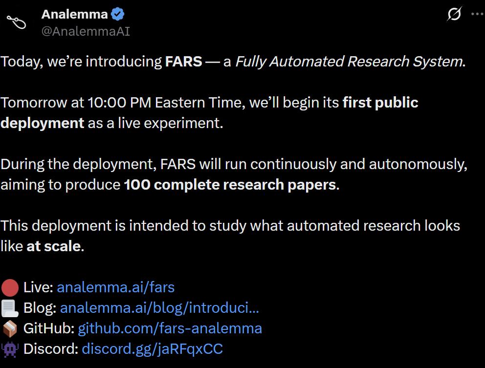 Core Viewpoint - Analemma, a startup led by Dr. Sun Tianxiang, is set to conduct a groundbreaking live broadcast of its Fully Automated Research System (FARS), aiming to autonomously produce 100 research papers over the course of a month, marking a significant milestone in AI-driven research [2][21]. Group 1: FARS Overview - FARS is designed as a fully automated research system that operates without human intervention, capable of conducting literature reviews, hypothesis generation, coding, experimental execution, and paper writing [5][7]. - The system consists of four intelligent agent modules: Ideation, Planning, Experiment, and Writing, interconnected through a shared file system that serves as both a workspace and memory [8][10]. Group 2: Live Broadcast Details - The live broadcast will showcase the deployment of FARS, with the goal of completing 100 research papers, and will be available for viewing at https://analemma.ai/fars/ [4][2]. - The broadcast is expected to be a unique event in the AI field, with the potential for both successful outcomes and unexpected challenges [2][4]. Group 3: Research Directions and Infrastructure - Suggested research directions for FARS include reinforcement learning with verifiable rewards, automated evaluation of advanced language models, and innovations beyond Transformer architectures, among others [10]. - Analemma has invested in a powerful infrastructure, including a cluster of 160 GPUs, to support the FARS system in its ambitious goal [10][12]. Group 4: Team Background and Funding - Analemma's team is notably young, with an average age under 30, and includes key contributors to major AI models like MOSS and InternLM [19][21]. - The company has successfully completed a multi-million dollar angel round of funding from notable investors, indicating strong financial backing for its innovative projects [21].