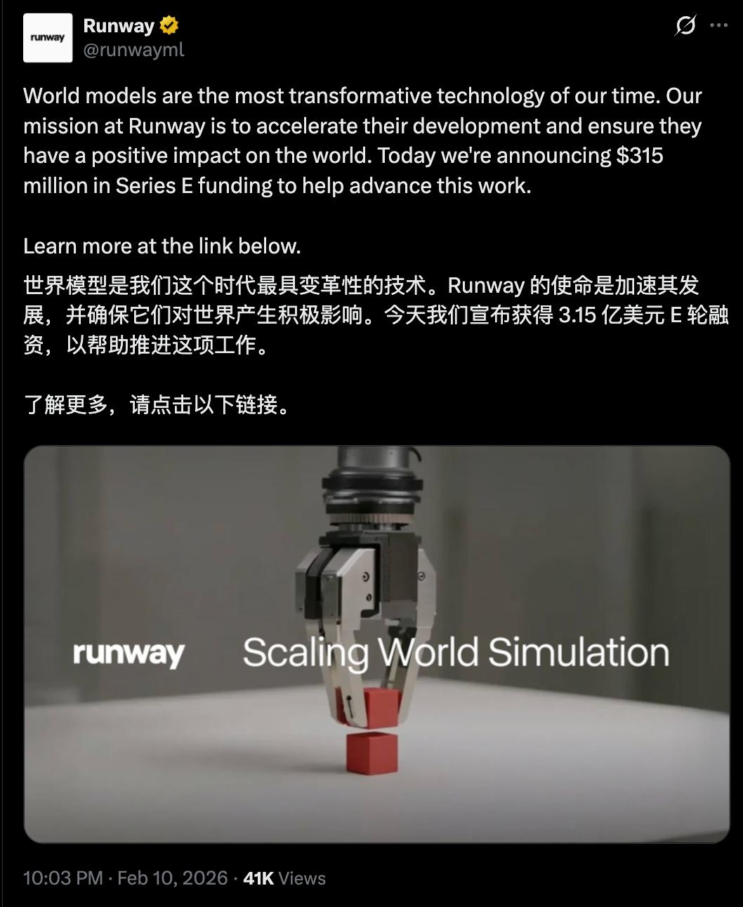 Core Insights - Runway, founded in 2018 by three NYU alumni, has raised a total of $815 million (approximately 5.6 billion RMB) in funding, with the latest round in April 2025 securing $308 million (approximately 2.1 billion RMB) from investors including SoftBank and NVIDIA, leading to a valuation exceeding $3 billion (approximately 20.7 billion RMB) [5][10] - The company is renowned for its video generation products and recently launched its latest model, Gen-4.5, which can produce high-fidelity outputs suitable for film, including complex scenes and realistic physical effects [5][10] - Gen-4.5 currently ranks third in the global AI text-to-video model performance leaderboard, outperforming notable models from Google and OpenAI [5][6] Funding and Future Plans - The new funding will be utilized to train the next generation of world models and expand into new products and industries [7] - Following the release of Gen-4.5, Runway introduced the General World Model (GWM-1), designed for real-time simulation and interaction, with three variants aimed at different applications [7][9] Technological Advancements - Runway is leveraging the NVIDIA Rubin platform to enhance its video generation and world model technologies, being one of the first teams to showcase video generation models on this platform [9] - The company has partnered with CoreWeave, a US AI cloud service provider, to expand its infrastructure and computational capabilities, with NVIDIA being a key supporter and supplier [9] Market Position and Competition - Runway's recent advancements have rekindled investor interest, especially after surpassing competitors like OpenAI Sora and Kuaishou Keling in benchmark tests [10] - The company is making significant investments in the world model sector, which is highly competitive, with advancements from Stanford's World Labs and Google's DeepMind [10]