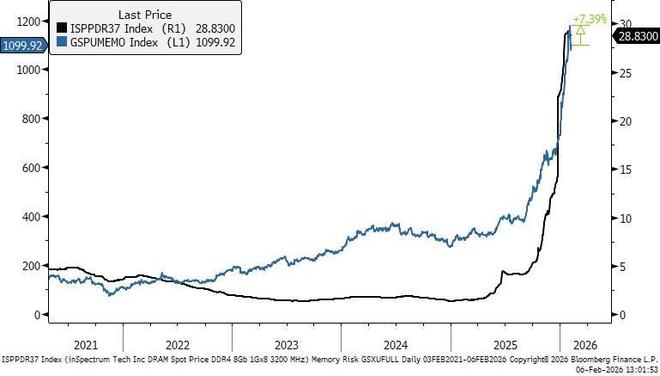 格隆汇2月8日|高盛交易员Louis Miller认为:本周,做多内存受益股对做空内存冲击股(图中蓝线)的配 对交易被市场波动影响,目前与内存价格(图中黑线)的差距扩大超7%。尽管软件及其他市场板块的市场 规模受到关注,但内存市场的基本面并未发生任何变化,而且,除非资本支出大幅放缓,否则人工智能 的日益普及应该会进一步推高需求。虽然该策略目前呈现动能倾向,但其基本面依然强劲。值得注意的 是,内存相关股的预期收益已增长超过两倍,而内存输入成本相关股的收益则落后于大盘。 ...