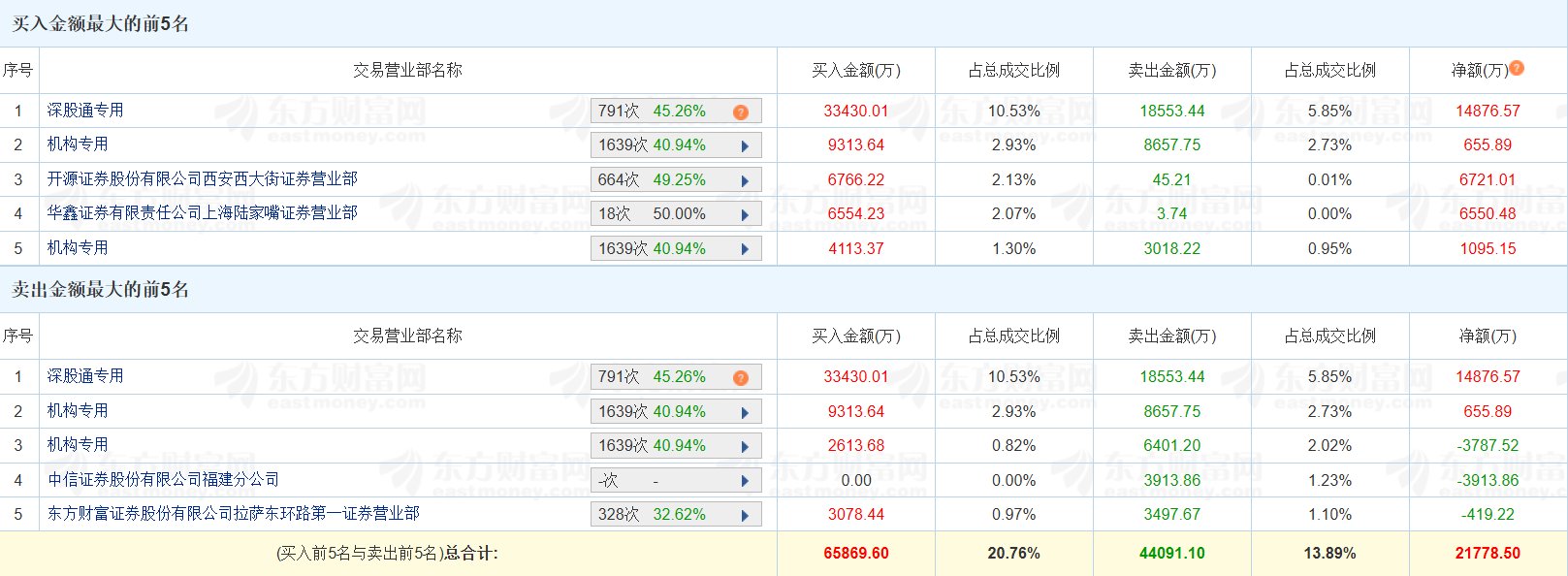 | 序号 | 交易营业部名称 | | 买人金额(万) | 占总成交比例 | | --- | --- | --- | --- | --- | | | 深股通专用 | 791次 45.26% | 0 33430.01 | 10.53% | | 2 | 机构专用 | 1639次 40.94% | 9313.64 | 2.93% | | 3 | 机构专用 | 1639次 40.94% | 2613.68 | 0.82% | | 4 | 中信证券股份有限公司福建分公司 | 次 | ▶ 0.00 | 0.00% | | 5 | 东方财富证券股份有限公司拉萨东环路第一证券营业部 | 328次 32.62% | L 3078.44 | 0.97% | | | (买入前5名与卖出前5名)总合计: | | 65869.60 | 20.76% | 融捷股份(002192.SZ)今日涨停,换手率19.84%,成交额31.73亿元。龙虎榜数据显示,深股通买入3.34亿元,卖出1.86亿元,净买入1.49亿元;游资"量化打 板"位列买三、买四席位,净买入1.33亿元。上榜席位全天买入6.59亿元,卖出4.41亿元,合计净买入2.18亿元 ...