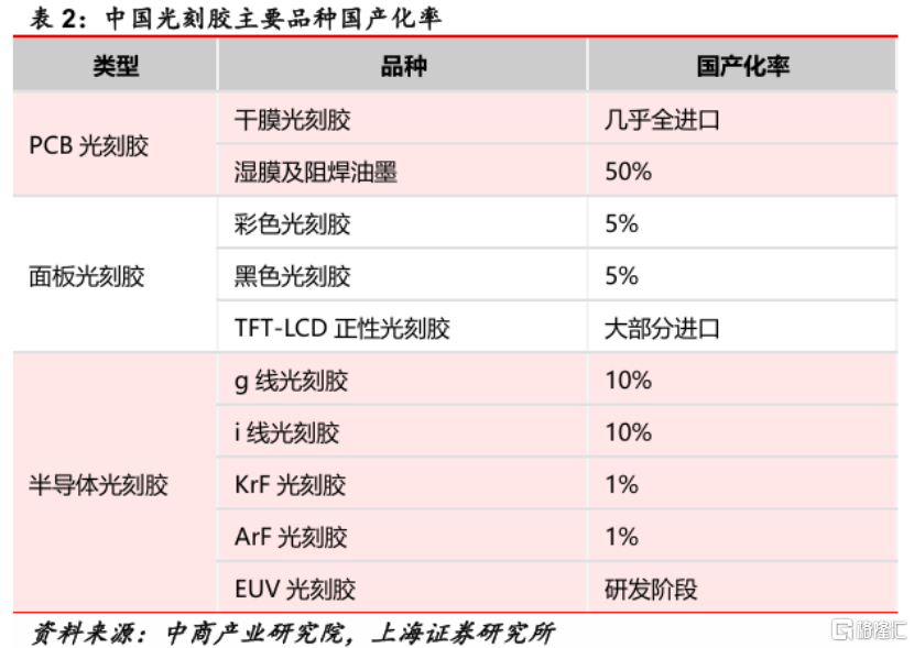 格隆汇获悉,彤程新材料集团股份有限公司(简称"彤程新材")于2月8日递表港交所,由国泰海通证券担任保荐人。 2018年6月27日,彤程新材在上交所上市,证券代码:603650.SH,截至2026年2月13日收盘,公司股价58.91元/股,市 值362.9亿元。 近年来,光刻胶的国产替代一直是市场重点关注的方向之一。 光刻胶是电子化学品产业"皇冠上的明珠",我国光刻胶产业起步较晚,且主要集中在中低端市场,国产化率较低,高 分辨率的光刻胶核心技术被日美垄断。 根据中商产业研究院数据显示,我国光刻胶生产中,技术难度较低的PCB光刻胶占比达94%,面板光刻胶占3%,技术 难度最高且全球市场份额最大的半导体光刻胶仅占2%。 近期,国产光刻胶企业彤程新材向港交所发起了冲击。 | 常运输 | 品种 | 国产化率 | | --- | --- | --- | | PCB 光刻胶 | 干膜光刻胶 | 几乎全进口 | | | 湿膜及阻焊油墨 | 50% | | 面板光刻胶 | 彩色光刻胶 | 5% | | | 黑色光刻胶 | 5% | | | TFT-LCD 正性光刻胶 | 大部分进口 | | 半导体光刻胶 | g 线光刻胶 | ...