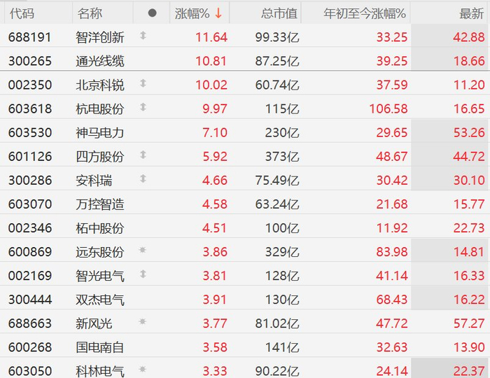 Core Viewpoint - The A-share market has seen a collective surge in power grid equipment stocks, driven by the increasing demand for AI and the recognition of electricity as a foundational element for technological advancement [1] Group 1: Market Performance - Zhiyang Innovation rose over 11.64%, with a total market value of 9.933 billion [2] - Tongguang Cable increased by 10.81%, reaching a market value of 8.725 billion [2] - Beijing Keri and Hangdian Co. both hit the daily limit, with market values of 6.074 billion and 11.5 billion respectively [2] - Shunma Electric grew by 7.10%, with a market value of 23 billion [2] - Sifang Co. increased by 5.92%, with a market value of 37.3 billion [2] - Other notable performers include Anke Rui, Wankong Zhizao, and Zhezhong Co., all showing gains above 4% [1][2] Group 2: Industry Outlook - The AI data center industry is expected to maintain high growth through 2026, supported by robust capital expenditure plans from leading internet companies [1] - Overseas power equipment manufacturers have shown strong performance, indicating high growth potential in the industry [1] - Companies providing power supply and distribution equipment for data centers are likely to see a surge in orders [1] - Technical service firms involved in smart grids, energy storage systems, and power dispatch systems will benefit from the ongoing smart grid transformation [1]