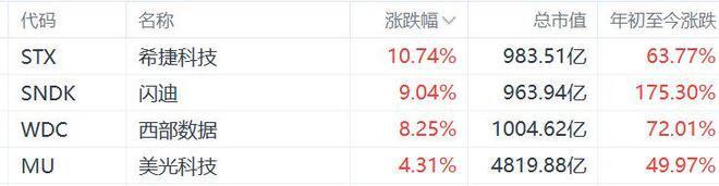 Group 1 - The core viewpoint of the article highlights the significant increase in stock prices of storage concept companies in the US market, with Seagate Technology rising nearly 11%, SanDisk up 9%, Western Digital increasing over 8%, and Micron Technology gaining over 4% [1]