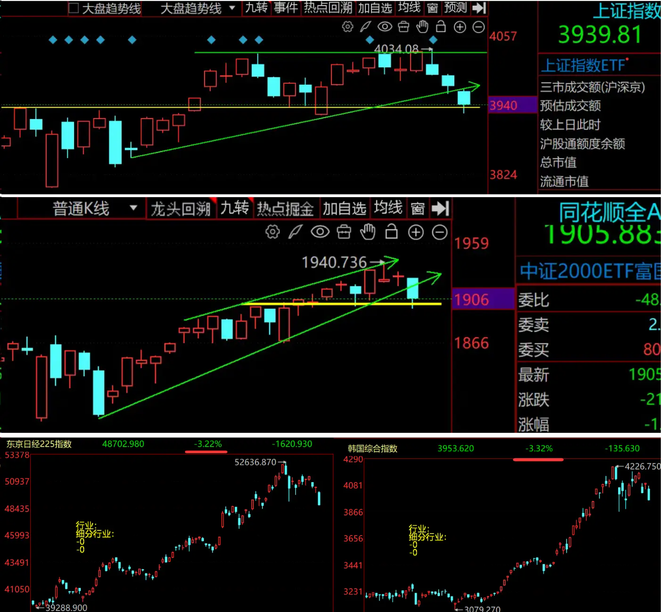 市场观察——小盘股活跃 今日三大指数再度全线收跌,其中沪指小幅跌破20日均线,深成指与创业板依旧延续震荡走低弱势结构,尾盘跌幅有所收窄。沪深两市成交额 1.91万亿,较上一个交易日缩量473亿。截至收盘,沪指跌0.46%,深成指跌0.11%,创业板指跌0.2%。 | | 九转 事件 热点回溯 加自选 均线 窗 预测 → 0 0 = 2 = 0 = | | 上证书写签 | 尤斗回新 刀砖 执占据全 加自选 均线 窗 ● @ / ◎ 中 四 日 中 日 日 日 / | | | | --- | --- | --- | --- | --- | --- | --- | | | | 3972.03 | | | | | | | | 上证指数ETF | | 2158:800 -- | | | | | | 3972 一市成交额(沪深京) | | | 老比 | 34.009 295.77 | | | | 预估成交额 3900 | | | 英语 | 145.67 | | | | 较上日此时 | | | 最新 | 2158.030 | | | | 沪股通额度余额 | | | 深度 1800 | +11.199 | | | | 008 ...