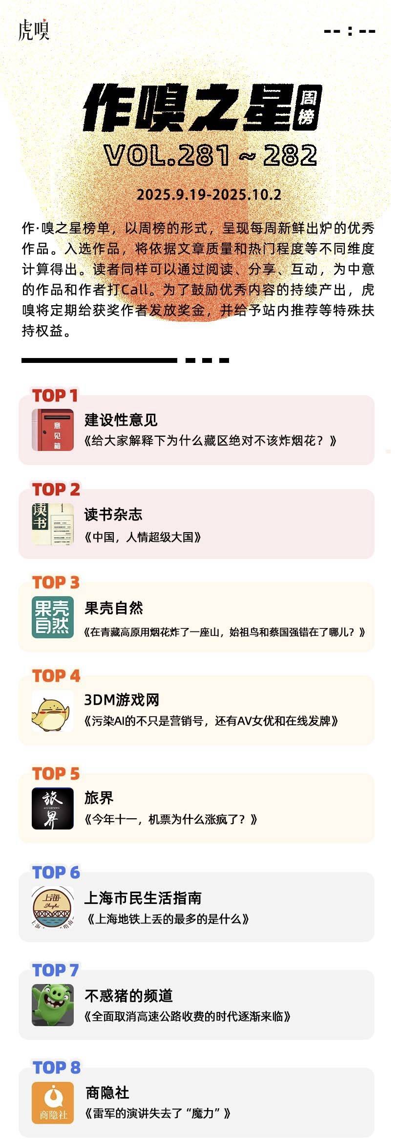 Core Points - The article presents the weekly ranking of outstanding works titled "作·嗅之星" from September 19 to October 2, 2025, highlighting the top articles and their authors [1][2][5]. Group 1: Top Articles - The top article is "给大家解释下为什么藏区绝对不该炸烟花?" by 建设性意见 [1][3]. - The second-ranked article is "中国,人情超级大国" by 读书杂志 [1][4]. - The third article is "在青藏高原用烟花炸了一座山,始祖鸟和蔡国强错在了哪儿?" by 果壳自然 [1][4]. - The fourth article is "污染AI的不只是营销号,还有AV女优和在线发牌" by 3DM游戏网 [1][4]. - The eighth article is "雷军的演讲失去了'魔力'" by 商隐社 [1][4]. Group 2: Additional Articles - The fifth article is "今年十一,机票为什么涨疯了?" by 旅界 [2][4]. - The sixth article is "上海地铁上丢的最多的是什么" by 上海市民生活指南 [2][4]. - The seventh article is "全面取消高速公路收费的时代逐渐来临" by 不惑猪的频道 [2][4]. Group 3: Selection Criteria and Support - The selection of articles is based on various dimensions such as quality and popularity [5]. - To encourage the continuous production of excellent content, the platform will regularly award bonuses to winning authors and provide special support rights [5].