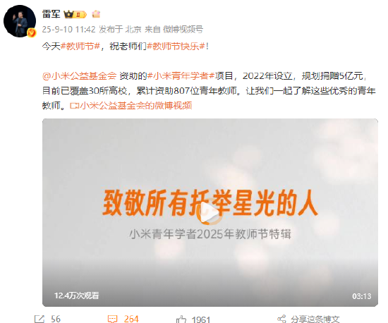 雷军发文祝老师们教师节快乐:小米规划捐赠5亿元,累计资助807位青年教
