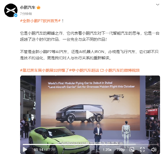 【#小鹏首款飞行汽车10月海外首飞#】#小鹏飞行汽车订单超5000个#9月9日消息,据小鹏汽车官微,小 鹏汽车董事长何小鹏在慕尼黑车站表示,小鹏汽车首款飞行汽车将在10月份,在迪拜迎来海外首飞。 他还透露,飞行汽车在最近数月收到了超过5000个订单,并且期望在2026年下半年进行交付。 ...