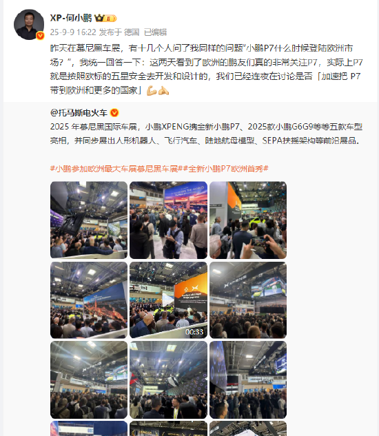 Core Insights - Xiaopeng Motors' Chairman He Xiaopeng highlighted significant interest in the P7 model during the Munich Auto Show, with multiple inquiries about its European market launch [1] - The company is considering accelerating the introduction of the P7 to Europe and other countries, emphasizing that the vehicle was developed and designed according to European safety standards [1] Group 1 - The P7 has garnered attention from European consumers, indicating a strong market interest [1] - The company is actively discussing the potential for a quicker rollout of the P7 in Europe and beyond [1] - The P7 was developed with a focus on achieving a five-star safety rating according to European standards [1]