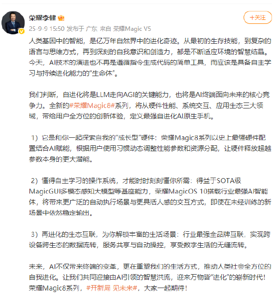李健强调,它是和你一起探索自我的"成长型"硬件,荣耀Magic8系列以史上最强硬件配置结合AI赋能, 根据用户使用习惯动态调整性能参数和资源分配,让硬件释放超越参数本身的更大潜能。 李健表示,今天AI技术的演进不再是遵循指令生成代码的简单工具,而应该是具备自主学习与持续进 化能力的"生命体"。 我们判断,自进化将是LLM走向AGI的关键能力,也将是AI终端面向未来的核心竞争力。全新的荣耀 Magic8系列将从硬件性能、系统交互、应用生态三大领域,带给用户全方位的创新体验,定义最强自 进化AI原生手机。 9月9日消息,荣耀CEO李健微博官宣将发布新一代旗舰Magic8,新机将配备2亿像素长焦镜头,并通过 大模型技术实现软硬件更新。 责任编辑:李思阳 ...