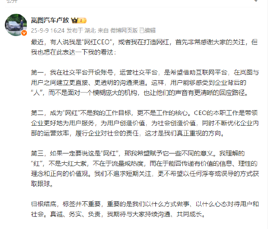 9月9日下午消息,岚图汽车科技有限公司 CEO卢放发微博谈到被称为"网红CEO",他表示,首先非常 感谢大家的关注,成为"网红"不是工作目标,更不是工作的核心。 以下为微博原文: 最近,有人说我是"网红CEO",或者我在打造网红,首先非常感谢大家的关注,但我也想在此表达一下 我的看法: 第一,我在社交平台开设账号,运营社交平台,是希望借助互联网平台,在岚图与用户之间建立更直 接、更透明的沟通渠道。这样,用户能够感受到企业背后的"人",而不是面对一个模糊庞大的机构,也 让他们的声音有更清晰的回应路径。 第二,成为"网红"不是我的工作目标,更不是工作的核心。CEO的本职工作是带领企业更好地为用户服 务,为用户创造价值,为社会创造价值,同时不断优化企业内部的运营效率,履行企业对社会的责任, 这才是我们真正重视的方向。 第三,如果一定要说这是"网红",那我希望赋予它一些不同的意义。我理解的"红",不是大红大紫,不 在于流量或热度,而在于能否传递有价值的信息、理性的理念和正向的价值观。我们不追求短期关注, 更不希望以任何浮夸或误导的方式获取眼球。 归根结底,标签并不重要,重要的是我们以什么方式做事、以什么心态对待用户和 ...