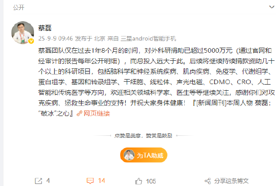 蔡磊:团队过去1年8个月对外科研捐助超5000万元