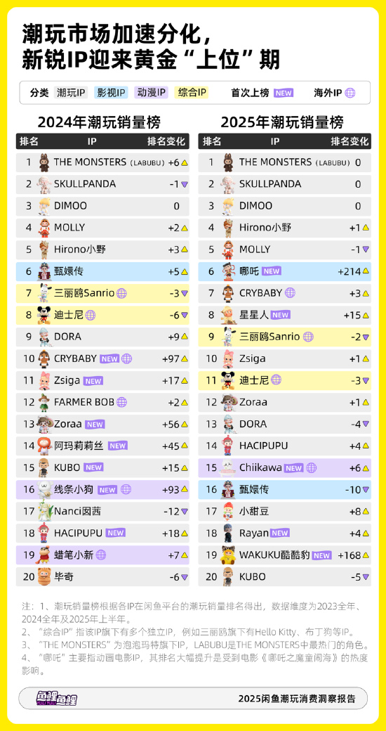 新浪科技讯 9月9日下午消息,《2025闲鱼潮玩消费洞察报告》发布,显示2025年潮玩交易迎来爆发式 增长,二季度闲鱼平台订单量同比提升330.2%,交易额增长309.7%。 《2025闲鱼潮玩消费洞察报告》显示,国内潮玩市场加速分化,本土新IP迎来黄金上升期。近两年,国 内设计师创作的新生代潮玩IP销量排名大幅跃升,例如2025年星星人上升15位,WAKUKU酷酷豹上升 168位,2024年Zorra上升56位。内容型IP例如《甄嬛传》和《哪吒》则受作品热度影响,商品销量波动 大。 当前国内潮玩市场由中国原创IP主导,海外IP的市场份额逐步被国内IP取代。据报告统计,今年上半年 仅有4个海外IP进入潮玩销量榜前20,海外IP占比从2024年的30%下滑至20%。去年在榜的韩国卡通IP线 条小狗,日本IP蜡笔小新均跌出榜单,老牌海外IP三丽鸥和迪士尼排名下滑。 無能量的 注:1、潮玩销量榜根据各IP在闲鱼平台的潮玩销量排名得出,数据维度为2023全年、 2024全年及2025年上半年。 2、"综合IP"指该IP旗下有多个独立IP,例如三丽鸥旗下有Hello Kitty、布丁狗等IP。 3、"THE MONST ...