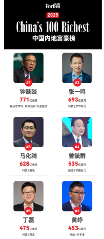 2025福布斯中国内地富豪榜发布:宁德时代曾毓群以535亿美元财富位列第四名
