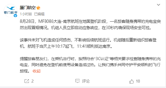 Core Points - Xiamen Airlines reported an incident involving flight MF8086 on August 28, where a passenger's power bank began to smoke during the boarding phase, prompting an emergency response from the crew [1][3] - The crew ensured the situation was safe and controllable within 30 seconds, and the incident did not cause any damage to the aircraft or affect subsequent flight operations [1] - After addressing the situation, the crew organized for passengers to re-board, and the flight successfully took off at 10:17 AM and arrived in Nanjing at 11:41 AM [1]