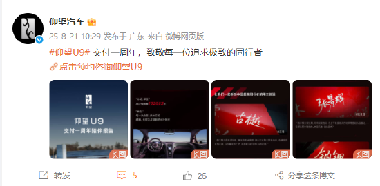 8月21日消息,仰望汽车发布"仰望U9交付一周年陪伴报告"。 报告显示,去年8 月21日首台仰望U9交付,在过去的一年里累计交付149台。仰望汽车表示,仰望U9成 为首个达成百台交付的中国超跑,是仰望的里程碑,更是中国汽车工业史的里程碑。 据了解,仰望U9的官方指导价为168万元人民币,定位于豪华电动SUV市场。 累计行驶里程 达到597392 公里 27 我们一直在追求极致的路上前行 2024年10月26日 极速391.94km/h 成为中国最速汽车 2024年11月4日 7分17秒 首战纽北阶段性成绩 这一年 仰望U9的身影穿梭于 174 个城市 2024年8月21日, 首台仰望U9交付 过去一年, 仰望U9累计交付149台 成为首个达成百台交付的中国超跑 这是仰望的里程碑,更是中国汽车工业史的里程碑 责任编辑:李思阳 ...