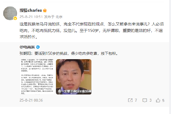 Core Viewpoint - Zhang Chaoyang, the founder of Sohu, refuted a statement attributed to him regarding living to 150 years old, emphasizing the importance of a balanced diet and quality of life over longevity [1]. Group 1 - Zhang Chaoyang clarified that the statement about living to 150 years and dietary preferences does not reflect his current views [1]. - He asserted the necessity of consuming meat for maintaining strength and immunity, countering the idea of a meatless diet [1]. - The focus should be on living well rather than merely extending lifespan, indicating a shift in perspective on health and longevity [1].