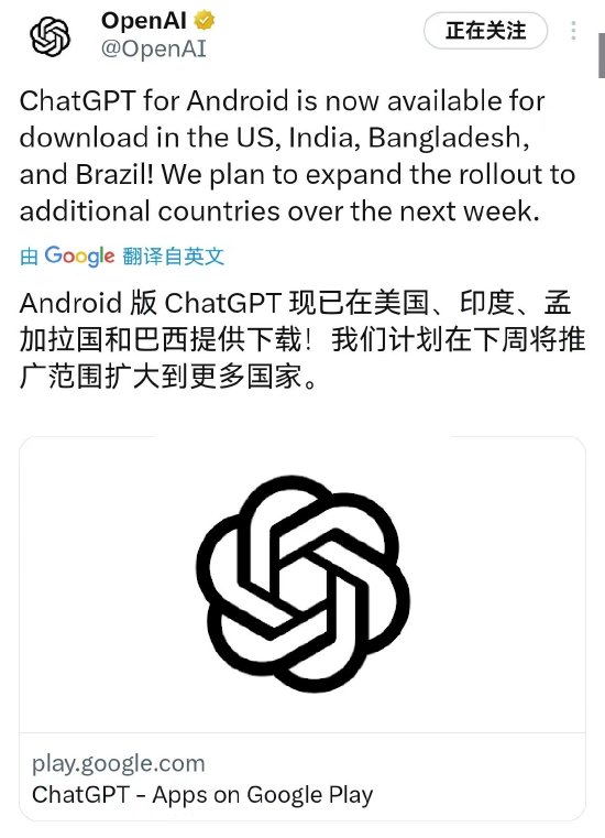 当地时间周二,OpenAI宣布,安卓版ChatGPT已正式上线,目前美国、印度、孟加拉国和巴西四国的安 卓用户可进行下载,并计划在下周拓展到更多地区。 ...