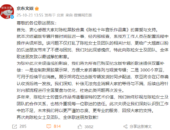 10月23日,@京东文娱 发微博表示,衷心感谢大家对陈粒黑胶合集《陈粒十年音乐作品集》的喜爱与 支持。就本次收藏版专辑开售时间延迟一事,经内部核查,系我方工作人员在配置流程中操作失误所 致。该问题不仅打乱了陈粒女士及团队的相关计划,更给广大翘首以盼的乐迷朋友带来了不便与困扰, 我们对此深感愧疚,特此向陈粒女士及团队、全体歌迷朋友致以最诚挚的歉意。为弥补此次失误造成的 影响,我们将为所有已购买纪念版专辑的歌迷提供双重补偿。 责任编辑:李思阳 ...