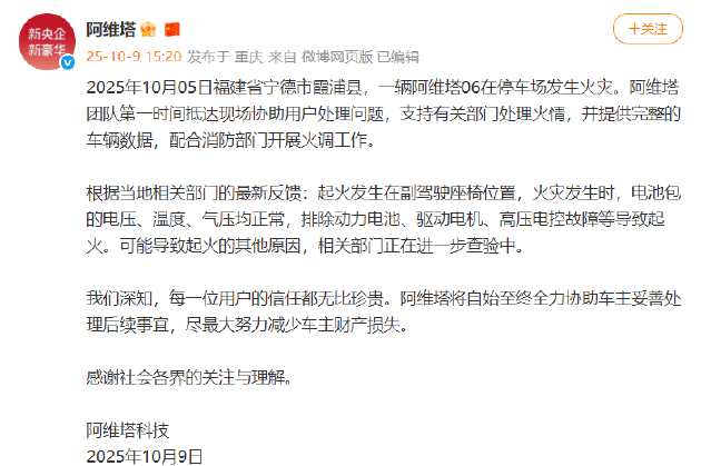 10月5日,一辆阿维塔06在停车场发生火灾,并波及停放在旁边的车辆,引发关注。 10月9日,阿维塔发布微博称,团队第一时间抵达现场协助用户处理问题,支持有关部门处理火情,并 提供完整的车辆数据,配合消防部门开展火调工作。 根据当地相关部门的最新反馈:起火发生在副驾驶座椅位置,火灾发生时,电池包的电压、温度、气压 均正常,排除动力电池、驱动电机、高压电控故障等导致起火。可能导致起火的其他原因,相关部门正 在进一步查验中。 阿维塔强调,"我们深知,每一位用户的信任都无比珍贵。阿维塔将自始至终全力协助车主妥善处理后 续事宜,尽最大努力减少车主财产损失"。 责任编辑:梁斌 SF055 ...