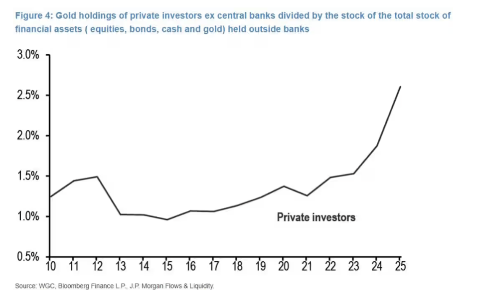 策略师们认为,今年黄金ETF的买盘热潮,不能完全用"贬值交易"(因担忧美元走弱而转向黄金)这一热门逻辑来解释。 "传统意义上的'贬值交易'并不包含'对冲股票风险'这一动机,但今年这一动机尤为明显——散户投资者同时买入股票与黄金,却避开了 长期债券(即传统上用于对冲股票风险的资产)。"帕尼吉佐格鲁及其团队称。 策略师们指出,2023年及2024年大部分时间里,散户投资者纷纷涌入长期债券(很可能是为对冲股价上涨风险),但今年即便股市持续 攀升,他们也未重现这一行为。相反,正如图表所示,黄金成为了他们的新选择。 对于厌倦了人工智能争议的人来说,本周黄金价格的大幅暴跌至少改变了讨论话题。 自周二黄金遭遇十多年来最大单日跌幅后,市场争论的焦点围绕"金价是否会重整旗鼓、再度冲高"展开。以高盛为例,该行仍坚持2026 年底金价达到每盎司4900美元的目标,并认为各国央行及机构投资者的需求将为金价带来上行风险。 "近期ETF资金流入速度及客户反馈显示,包括主权财富基金、各国央行、养老基金、私人财富管理机构及资产管理公司在内的众多长期 资本配置者,正计划增加黄金持仓,将其作为投资组合的战略性分散工具。"分析师莉娜·托马斯(Li ...