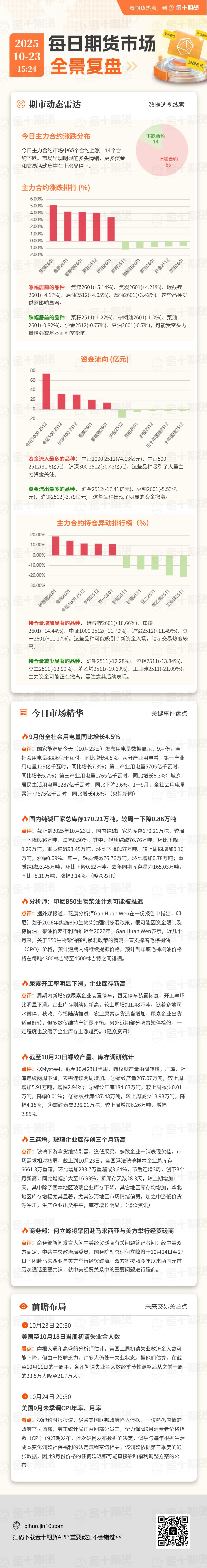 EFF 2025 10-23 15:24 $ 期市动态雷达 今日主力合约涨跌分布 今日主力合约市场中65个合约上涨,14个合 约下跌。市场呈现明显的多头情绪,更多资金 和交易活动集中在上涨品种上。 主力合约涨跌排行 (%) 看期货热点,到 3 金十期货 6.00% 5.00% 4.00% 3.00% 2.00% 1.00% 0.00% -1.00% -2.00% 涨幅居前的品种: 焦煤2601(+5.14%)、焦炭2601(+4.21%)、碳酸锂 2601(+4.17%)、原油2512(+4.05%)、燃油2601(+3.42%)。这些品种受 数据透视线索 下跌台资 14 供需影响显者。 跌幅居前的品种: 菜籽2511(-1.22%)、棕榈油2601(-1.0%)、菜油 2601(-0.82%)、沪金2512(-0.77%)、豆油2601(-0.7%),可能受空头力 量增强或基本面利空影响。 资金流回 (1 80 60 40 20 0 -20 资金流入最多的品种:中证1000 2512(74.13亿元)、中证500 2512(31.6亿元)、沪深300 2512(30.43亿元),这些品种吸引了大量主 力资金 ...