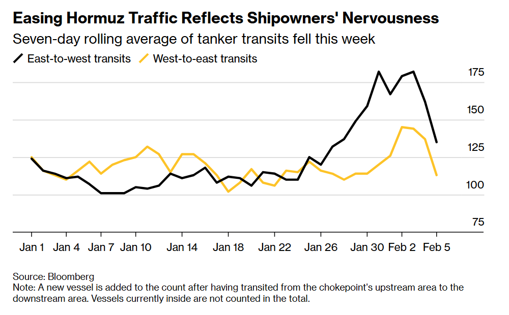 由于担心美伊紧张局势加剧以及霍尔木兹海峡航运可能面临的风险,部分超大型油轮运营商正让旗下船舶加快通过这一海上咽喉要道。 船舶追踪数据显示,超大型原油运输船(VLCC)正以最高17节的航速驶过这条狭窄且拥堵的航道——全球约四分之一的海运石油贸易均途经此 地。一艘满载的超大型原油运输船总长约330米(1080英尺),操控难度大,其常规最高航速约为13节。 据负责调度船舶通行该航道的船东和经纪商透露,上周伊朗宣布将开展实弹演习后,部分运营商便启动了提速措施。知情人士表示,这一欧佩克产 油国本周至少两次发出警告,称将在该区域周边开展实弹演习,不过截至目前尚未观测到相关演习行动。 当前,伊朗相关紧张局势叠加船舶供应紧张,已导致本就波动的航运市场运价飙升,而油轮提速的举动进一步加剧了市场的不确定性。与此同时, 在美国与伊朗定于本周五晚些时候在阿曼举行谈判前,美方仍在持续增强其在该地区的军事部署。 Optima Shipping Services市场策略团队负责人安杰莉卡・凯梅内(Angelica Kemene)表示:"即便地缘政治头条风险有所降温,霍尔木兹海峡的运营 环境依然复杂,船东对于需要数日才能完成的海峡航道航行始 ...