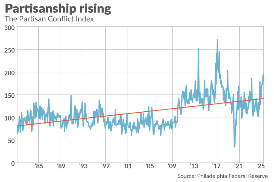 音频由扣子空间生成 MarketWatch专栏作家Mark Hulbert认为,投资者若认为美国政府当前的停摆不会产生严重的长期后果,那他们就是在自欺欺人。 研究发现,政治极化的加剧会导致企业投资大幅减少,而且这种减少不会很快得到逆转。这意味着,由于政治极化,长期经济增长将 会相应降低。 该研究将华盛顿目前的预算僵局置于一个令人担忧的背景之下。即使停摆结束,导致停摆的强烈政治极化几乎肯定会继续,而经济也 将受到影响。 Hulbert所提到的研究是由里士满联储的高级经济学家兼研究顾问玛丽娜·阿齐蒙蒂(Marina Azzimonti)撰写的。她的研究《党派冲突 与私人投资》("Partisan Conflict and Private Investment")于2018年发表在《货币经济学杂志》(Journal of Monetary Economics)上。 AI播客:换个方式听新闻 下载mp3 阿齐蒙蒂的发现应该让所有人,无论是共和党人还是民主党人,都感到恐惧。从上面的图表中可以看出,PCI的长期趋势是稳步上升 的。其最近的数值是2007-2009年期间的两倍多,这意味着如果不是美国政府功能失调,企业投资将 ...