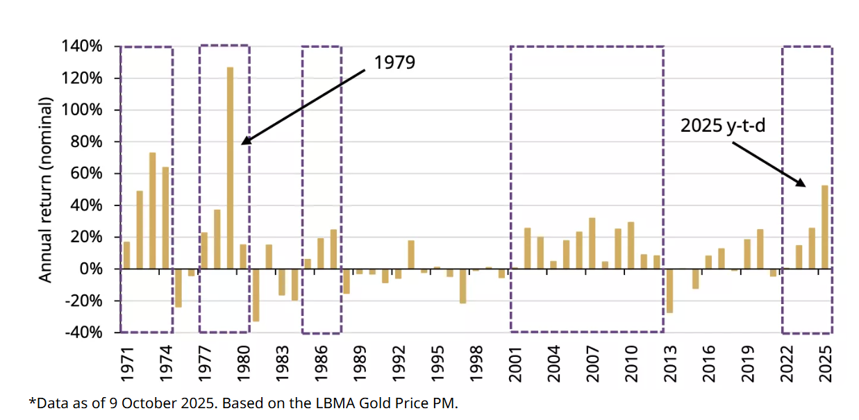 2025年10月8日,现货黄金价格突破每盎司4000美元,创下又一历史里程碑,且当周收盘仍站稳在这一历史高点上方,朝着1979年以来年度最佳表现迈进。 这也让许多人追问:黄金涨势还剩多少空间? 按名义价值计算的黄金年回报率 市场热衷于将此次金价走势与70年代末的行情对比,引发广泛讨论——投资者正评估,金价突破4000美元是趋势延续的信号,还是反转的开端。 诚然,黄金近期涨势迅猛,但客观看待这一现象至关重要。 正如全球黄金协会(WGC)在黄金突破每盎司3000美元时所指出的,整数关口里程碑更多承载心理与技术层面意义,而非基本面价值。值得关注的不应只 是黄金单年表现,更应是牛市的持续时长与核心驱动因素。例如,当前黄金涨势的持续时间与幅度,仍低于历史上历次牛市的平均水平。金价上涨的核心驱 动力是什么? WGC的分析显示,今年金价上涨的核心动力是"以西方为主导的投资需求激增":全球投资者在地缘政治紧张局势、美元走弱、美联储进一步降息预期,以 及股市回调担忧的推动下,纷纷转向黄金避险。此外,各国央行持续增持黄金不仅拉动了实物需求,也巩固了市场看涨预期。 此次金价上涨速度尤为显著:从每盎司3500美元升至4000美元仅用 ...