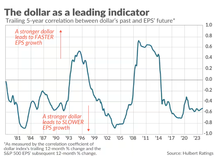 过去一周,美元指数表现强劲,但上周五疲软的非农数据令其涨幅大幅收窄。该指数在上半年暴跌近 11%,创下自1970年代初创立以来的最差上半年纪录。 那么美元作为领先指标的表现如何?赫伯特进一步观察美元年度变化是否与EPS后续增长率相关,但得出 了类似结论。下图显示,自1970年代以来,美元过去12个月的变化与标普500 EPS未来12个月增长率的相 关性并不稳定。 回顾历史,弱势美元被视为对美国股市有利——毕竟在近期美元贬值期间,标普500指数总回报率达 6.2%。但美国股市也曾在美元异常强劲的年份表现惊人。因此,美元波动或许对以美元计价的投资者无关 紧要。 然而,若美联储如特朗普政府所愿大幅降息,导致美元急剧贬值,股市反弹可能出现负面反应。这种情况 曾在1987年10月发生过。 为深入分析,《市场观察》专栏作家马克·赫伯特(Mark Hulbert)首先评估了美元指数作为标普500每股收 益(EPS)同步指标和领先指标的历史表现。 在研究美元作为同步指标的潜力时,赫伯特几乎一无所获。自1973年以来,美元指数的年度波动仅能解释 或预测标普500指数EPS同期波动的1%(以R平方值衡量)。这种近乎零的相关性源于 ...