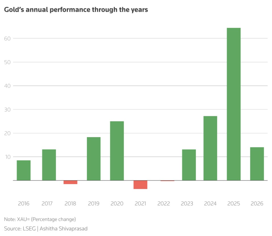 现货黄金价格周一突破每盎司5000美元关口创历史新高,分析师预计,受全球地缘紧张局势持续升级,以及各国央行和零售市场强劲买盘支 撑,金价今年将进一步攀升。 诺曼表示:"目前唯一可以确定的似乎只有不确定性本身,而这正是黄金的最大利好。" 受地缘政治与经济风险冲击市场影响,黄金价格一度冲高至5110美元以上。这一避险资产在2025年大涨64%后,今年涨幅已超17%。 黄金近年来的年度表现 伦敦金银市场协会年度贵金属预测调查显示,分析师预计2026年黄金价格最高将触及7150美元,全年均价为4742美元。 高盛集团已将2026年12月黄金价格预期从4900美元上调至5400美元。 独立分析师罗斯・诺曼(Ross Norman)则预计,黄金价格今年高点将达6400美元,全年均价为5375美元。 金属聚焦咨询公司董事菲利普・纽曼(Philip Newman)称:"随着美国中期选举临近,政治层面的不确定性或进一步加剧。与此同时,市场对 美股估值过高的担忧始终存在,这或将推动更多资金为分散投资组合而流入黄金市场。" 他补充道:"在突破每盎司5000美元的里程碑后,我们预计金价将继续走高。" 各国央行购金热情居高不下 202 ...