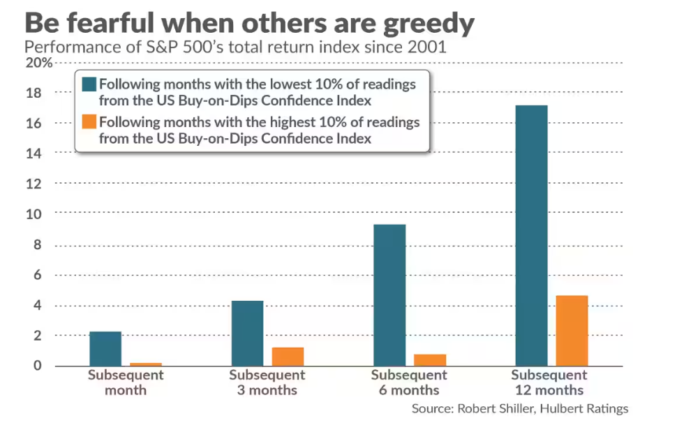 在线交易平台罗宾汉(Robinhood Markets)的相关研究,为"上周五抄底潮需谨慎"提供了进一步证据——该平台吸引了大量散户投资者。 这项名为《注意力驱动交易与回报:来自罗宾汉用户的证据》的研究的作者发现,平均而言,某一天被罗宾汉投资者大量买入的股票,在接下 来一个月的表现会比市场整体落后5%。 MarketWatch专栏作家Mark Hulbert指出,尽管上周五道指暴跌近900点,但散户投资者热切抄底,这是一个危险信号。 这一投资者行为实则利空市场,因其逢跌买入意愿是反向指标:当投资者将下跌视为买入机会时,股市往往接近顶部;而在底部时情况恰好相 反——投资者不相信任何反弹能持续,会把每次市场上涨都当作进一步抛售的时机。 耶鲁大学金融学教授罗伯特·希勒(Robert Shiller)收集的数据印证了这一观点。自2001年起,他开始计算"逢跌买入信心指数",该指数用于衡 量"认为股市大幅下跌次日会反弹"的散户投资者比例。从附带图表可见,标普500指数在该指数处于高位后的表现,平均远差于指数低位后的表 现。 需注意的是,希勒的"逢跌买入信心指数"更新存在数月滞后,因此尚不清楚上周散户的行为会如何影响10 ...