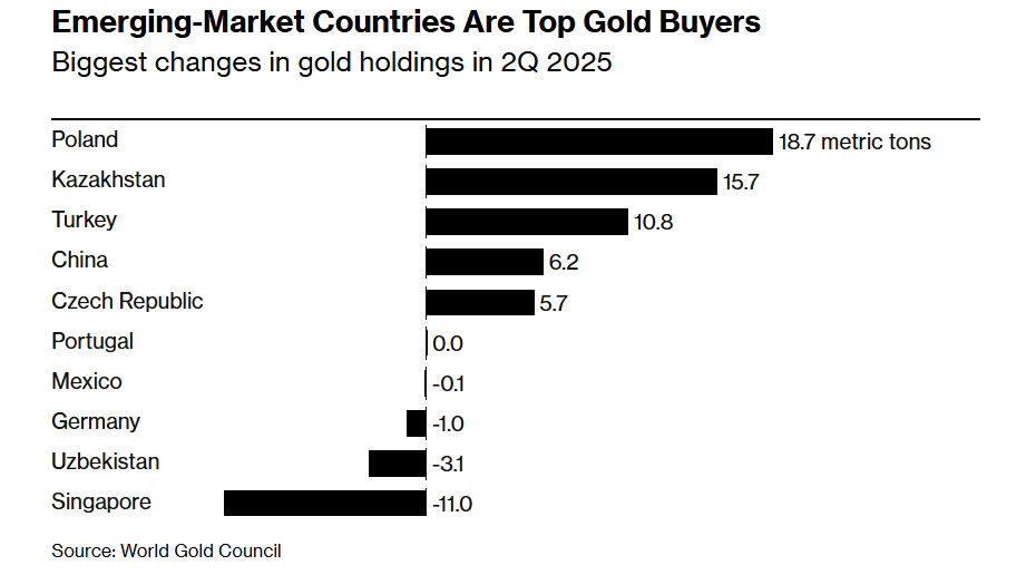 南非拥有全球最深的金矿,该国股市正迎来二十年来表现最佳的一年——西巴尼亚静水矿业公司(Sibanye Stillwater Ltd.)、英美黄金阿 散蒂公司(AngloGold Ashanti Plc)、金田公司(Gold Fields Ltd.)等矿企股价已涨至三倍。非洲最大黄金生产国加纳,其信用评级也获得 穆迪评级(Moody's Ratings)上调。新兴市场国家跻身全球最大黄金买家行列,为国家财政收入注入强心剂。 2025年第二季度黄金持有量变化的国家排名 淘金潮支撑新兴市场乐观情绪 黄金价格持续飙升为新兴市场带来意外红利,提升了投资者对黄金开采国与购买国的信心。 对新兴市场基金经理而言,黄金上涨为他们维持看涨立场再添理由。黄金价格飙升为生产国与购买国均带来财富效应,丰厚的黄金持有量 让投资者更有信心买入相关资产。高盛集团策略师在本月初的报告中指出,南非强劲的矿业实力是其看好该国债券与股市后续上涨的核心 原因之一。 "黄金涨势对乌兹别克斯坦、加纳、南非等少数新兴市场国家有利。"威廉·布莱尔投资管理公司(William Blair Investment Management)投 资组合经理丹尼尔·伍德( ...