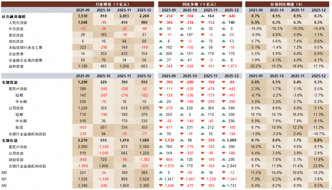 Core Viewpoint - The People's Bank of China (PBOC) released December financial data indicating a mixed performance in credit growth, with corporate lending showing strength while household demand remains weak [1][2]. Group 1: Social Financing and Loan Data - New social financing in December was 2.2 trillion yuan, a year-on-year decrease of 646 billion yuan, with a stock growth rate down 0.2 percentage points to 8.3% [1]. - New RMB loans amounted to 910 billion yuan, an increase of 80 billion yuan year-on-year, with a stock growth rate of 6.3%, down 0.1 percentage points from the previous month [1]. - Corporate loans saw a significant increase, with new corporate loans of 1.1 trillion yuan, up 580 billion yuan year-on-year, attributed to a low base from the previous year and policy support [2][3]. Group 2: Household Loan Demand - Household loans continued to show a year-on-year decrease, with a net reduction of 92 billion yuan in December, down 442 billion yuan year-on-year, indicating persistent weak consumer demand [2]. - Short-term household loans decreased by 161 billion yuan year-on-year, marking the third consecutive month of decline, while medium to long-term loans also saw a reduction of 290 billion yuan, reflecting a lack of recovery in housing credit demand [2]. Group 3: Government Debt and Social Financing Growth - The slowdown in social financing growth was primarily due to a seasonal mismatch in government debt issuance, with new government bonds decreasing by 1.1 trillion yuan year-on-year [2]. - Despite the December decline, government debt issuance for the year increased by 2.5 trillion yuan, accounting for 39% of the total social financing increase for the year [2]. Group 4: Monetary Policy Signals - The PBOC announced a 0.25 percentage point reduction in the interest rate for structural monetary policy tools, which is expected to contribute approximately 0.5 basis points to bank interest margins [4]. - The expansion of structural tools includes a total of 1 trillion yuan for agricultural and small enterprise loans, and an increase in the quota for technology innovation loans to 1.2 trillion yuan [4]. - The PBOC indicated that there is still room for further interest rate cuts and reserve requirement ratio reductions, with expectations of a 0.5 percentage point cut in the reserve requirement ratio and a 10-20 basis point cut in interest rates throughout the year [4]. Group 5: Market Outlook - The banking sector is expected to have sufficient credit project reserves for January, with credit issuance anticipated to remain stable or increase year-on-year [5]. - The weak demand for retail credit persists, linked to sluggish consumer and real estate demand, while demand in infrastructure and manufacturing sectors remains robust [5].