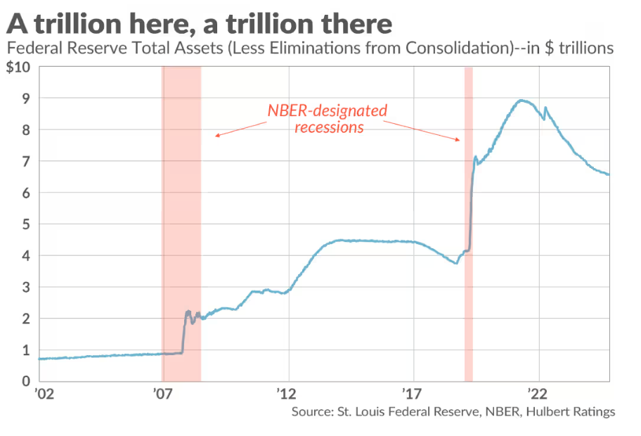 MarketWatch专栏作家Mark Hulbert认为,美联储主席鲍威尔宣布,美联储将很快结束其资产负债表缩减计划,即量化紧缩(QT),这 一政策转变并不像大多数投资者认为的那样会成为股市的利好因素。 当然,美联储的决定意义重大,该央行一直在从金融体系中抽走大量流动性。由于部分流动性原本可能会流入股市,因此量化紧缩想必 一直是股市的重大阻力:自2022年6月以来,美联储已将其资产负债表缩减了2.2万亿美元。从表面上看,结束量化紧缩应该会给股市带 来大幅提振。 然而,历史经验却恰恰相反。在过去二十年里,股市在量化紧缩时期的表现要优于美联储向市场注入流动性的量化宽松(QE)时期。 就拿2022年6月以来最近的量化紧缩阶段来说。在美联储从金融市场抽走2.2万亿美元的这段时间里,标普500指数(SPX)的总回报指 数年化增长率达到了20.9%,约为其历史平均水平的两倍。 最近的这一经历并非个例。自2003年以来,在美联储资产负债表收缩的12个月期间,标普500指数平均涨幅为16.9%。而在美联储资产 负债表扩张的12个月期间,平均涨幅仅为10.3%。 美联储资产负债表规模 从上面的图表可以看出,在2008年全球金 ...