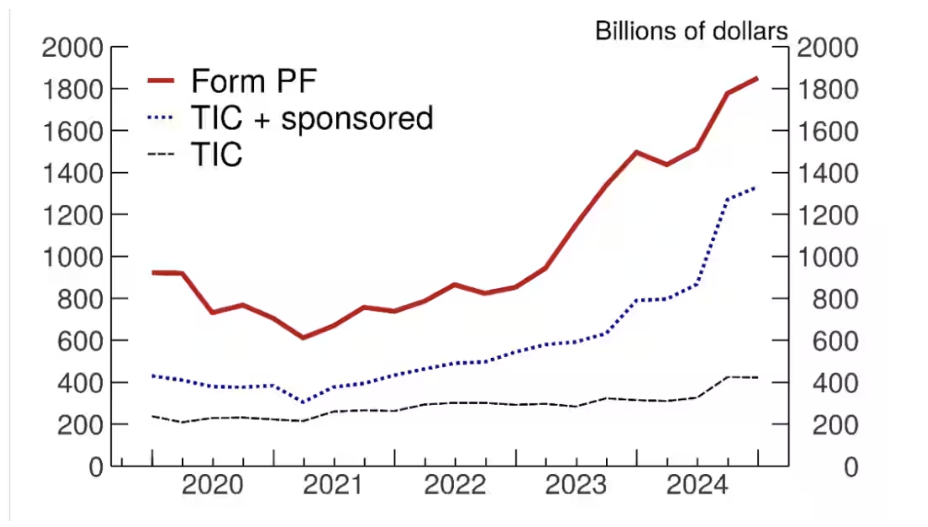 Core Insights - The U.S. Treasury's data significantly underestimates the amount of U.S. government debt held by hedge funds registered in the Cayman Islands, with an estimated underreporting of approximately $1.4 trillion by the end of 2024 [1][3] - The Federal Reserve's report highlights that the Treasury International Capital (TIC) data fails to capture the dominance of Cayman Islands hedge funds in basis trading, which has raised concerns among regulators [1][2] Group 1: Underestimation of Debt Holdings - As of the end of 2024, hedge funds in the Cayman Islands are estimated to hold $1.85 trillion in U.S. Treasury securities, an increase of $1 trillion since 2022 [3] - The report indicates that Cayman Islands hedge funds have become the marginal foreign buyers of U.S. Treasuries, surpassing the holdings of China, Japan, and the UK [3][4] - The discrepancy between TIC data and reports to the SEC regarding the amount of U.S. debt held by these funds has widened to nearly $1.4 trillion [3] Group 2: Basis Trading Concerns - Basis trading, which involves leveraging to exploit price differences between Treasury futures and cash bonds, has been a source of concern for regulators since at least 2018 due to its potential to trigger broader financial instability during market downturns [2] - The reliance on leverage by hedge funds in basis trading has raised alarms for the Federal Reserve and the Treasury, especially following market instability linked to these trades in March 2020 [2] - The TIC data serves as a primary source for understanding cross-border capital flows, and the underestimation of Cayman hedge fund holdings poses a significant obstacle for researchers and policymakers analyzing these flows [2]