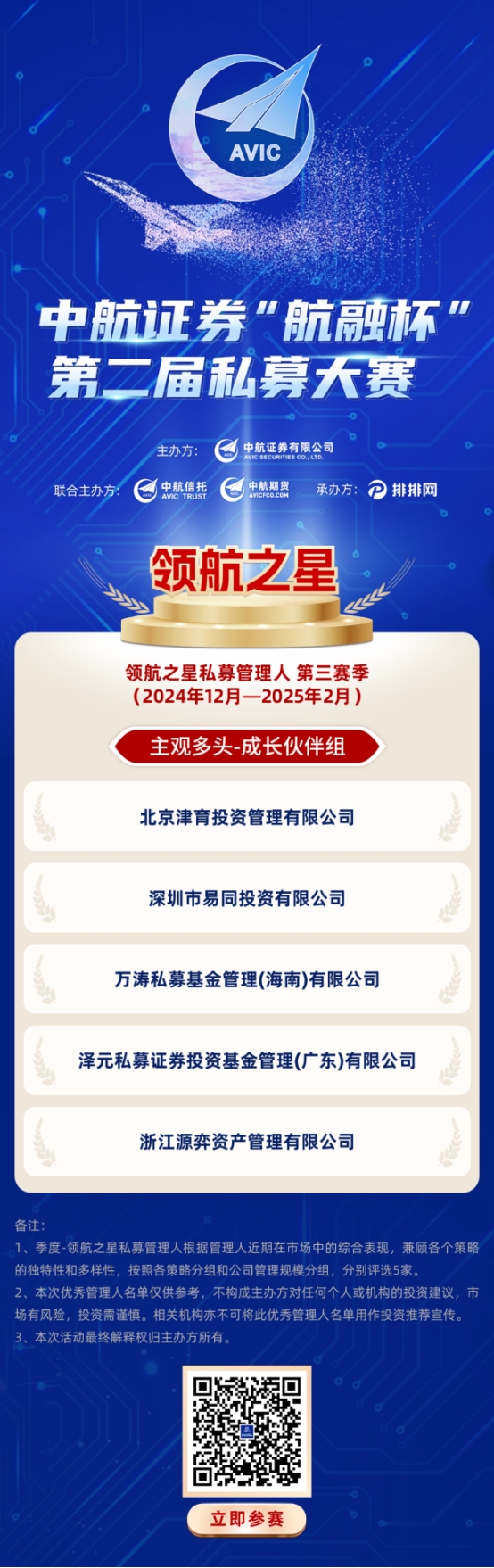 逐梦长空,振翅高翔|中航证券第二届“航融杯”私募大赛第三赛季(2024年12月-2025年2月)杰出私募名单火热出炉