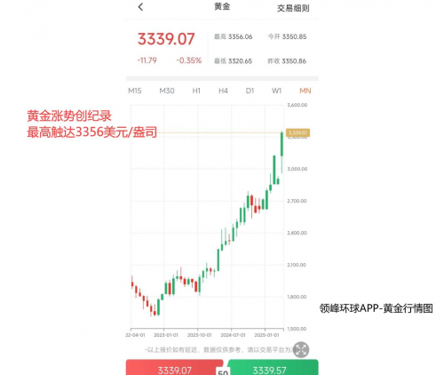 2025黄金猛涨,震惊世界。截止4月17日,黄金最高触及3356,为历史首次!无论专业投资者,还是普 通个人,谁都能感受到黄金散发的耀眼光芒。领峰环球APP行情显示,百余天时间,金价持续爆发式冲 刺,涨幅已超27%,逾20次刷新历史纪录。领峰环球立即为您解读,金价暴涨背后三大推手,以及接下 来,黄金究竟该买还是卖? 一、衰退发酵,黄金底盘强劲 四、 牛市掘金,$10低门槛布局 图源:领峰环球APP 在上述三重因素强力支撑下,未来,黄金或有望迎来更强势增长。人们在探寻,金价已经连破新高,现 在该买还是该卖? 短线大量投资者涌入,你需要警惕市场的拥挤超买,但却无需害怕金价太贵,也不必担忧黄金不会再 涨。这个涨跌双赚的市场,每一轮波动都孕育良机。在领峰环球,投资者无需高价支付,最低仅10美 元,即可直通市场、把握这轮"牛市";小额投入,就能轻松上分,分享黄金上涨带来的红利。 黄金占据2025投资主力,看涨情绪持续升温,多头动能仍丝毫未减,此时每一次的回调,或都将成为资 金抢筹的绝佳机会。 二、避险之巅,黄金站稳3300 再来是全球地缘局势,火山一样频频发酵,避险情绪从未降温,黄金一浪接一浪、蓄力冲刺,本周突破 33 ...