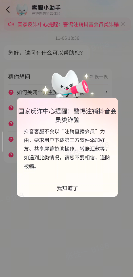抖音提醒广大用户,抖音客服绝不会给用户打电话称"某项服务/会员即将自动扣费",也不会要求用户 下载其他软件协助关闭会员,更不会要求用户"共享屏幕",以上情形都是诈骗。如遇可疑电话和信息, 用户可以拨打抖音官方服务热线95152进行核实,或在抖音App搜索"验证助手",输入电话号码、短信 内容、网址等验证是否来自抖音官方。 民警接到线索后,第一时间拨打了用户电话,但无人接听。民警赶到用户住处时,用户正在使用一款远 程控制软件,已无法自己操作断开网络,也无法关机。民警一边协助用户拔出手机卡断网,一边联系当 | 16:25 | | | ::!! 5G 63 | 16:25 | | ::!! 5G 63 | | --- | --- | --- | --- | --- | --- | --- | | く 客服中心 | Q 封禁处罚 | | | < | | 线索反馈 | | Hi~ 很高兴为你服务 | | | | 官方信息验证助手 官方信息 抖音守护 | | | | 处罚 | 订单 | | 全部 > | 验证是否属于官方 | | | | 重置名字 | | | | 短信 电话 网址 | 邮箱 账号 | 活动 | | 已结束 ...
