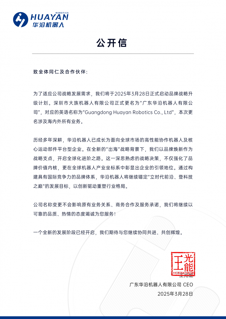 2025年,中国智能制造领域迎来里程碑时刻——高端协作机器人领军企业"深圳市大族机器人有限公 司"正式更名为"广东华沿机器人有限公司"(简称"华沿机器人"),以全新品牌形象迈向全球化征程。此次 更名不仅标志着品牌战略的全面升级,更延续了大族机器人一脉相承的技术血脉,彰显中国智造从本土 深耕到全球崛起的坚定步伐。 华沿机器人的诞生,根植于中国高端制造领域两大标杆的深厚积淀。其前身大族机器人,脱胎于全球激 光装备龙头大族激光。大族机器人自成立之初便在精密制造、运动控制等核心技术领域拥有基因,并聚 焦国产高端协作机器人赛道,目前已经成长为国内核心技术自主可控的重点企业。如今,华沿机器人接 过接力棒,以"立时代前沿,登科技之巅"为使命,将传承大族协作机器人的全部技术及经验,进一步开 启全球化智造新征程。 根据大族机器人发布的品牌战略升级计划,华研机器人(原大族机器人)将推出人形机器人关节模组、超 大负载协作机器人等创新产品,突破行业技术瓶颈,进一步强化全球化布局。公司名字切换后续合作等 相关问题是合作伙伴、客户关注的重点关切,华沿承诺全面承接原大族机器人的所有合同、订单及售后 服务,确保合作伙伴权益"零折损"。 "机 ...