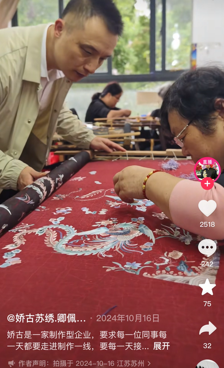 当"新中式"成为年轻人追捧的潮流密码,大众又重新爱上了承载着中华独特美学的绫罗绸缎。 其中,苏绣作为传承千年的"针尖上的艺术",曾经只归属于博物馆的玻璃展柜。每一件苏绣作品的背 后,都是绣娘数月甚至数年的工时堆叠。很长时间以来,在大众的眼中,苏绣既是"一寸绣品一寸金"的 中式奢侈品,也是一个"遥不可及"的文化符号。 导语:今年初,抖音电商发布史上力度最大的九大商家扶持政策。1-2月已累计为商家节省超过30亿 元,持续不断地帮助商家降低成本,提升经营体验。针对中小商家推出的"小商家帮扶基金",更是涵盖 了从降低保证金到推广金流量激励、千川优惠券等一系列帮扶措施,帮助中小商家提升自身的经营能 力。 新中式风潮下的新可能 直到新中式美学借由短视频平台的传播而崛起后,大众也通过苏绣商家的直播间看到另外一种可能性: 苏绣既能是国礼,也能走进大众生活。 在苏绣中小商家的直播间中,我们了解到,传承非遗并非只有技艺流传这一种途径。现在,非遗手工制 品正在突破过往的边界,苏绣不再只有"收藏"这一种可能性,也可以成为陪伴每个人的日常美学的一部 分。 "每件苏绣成衣都有自己的身份证" 早上8点,娇古苏绣的绣娘,已经戴着老花镜和套袖 ...