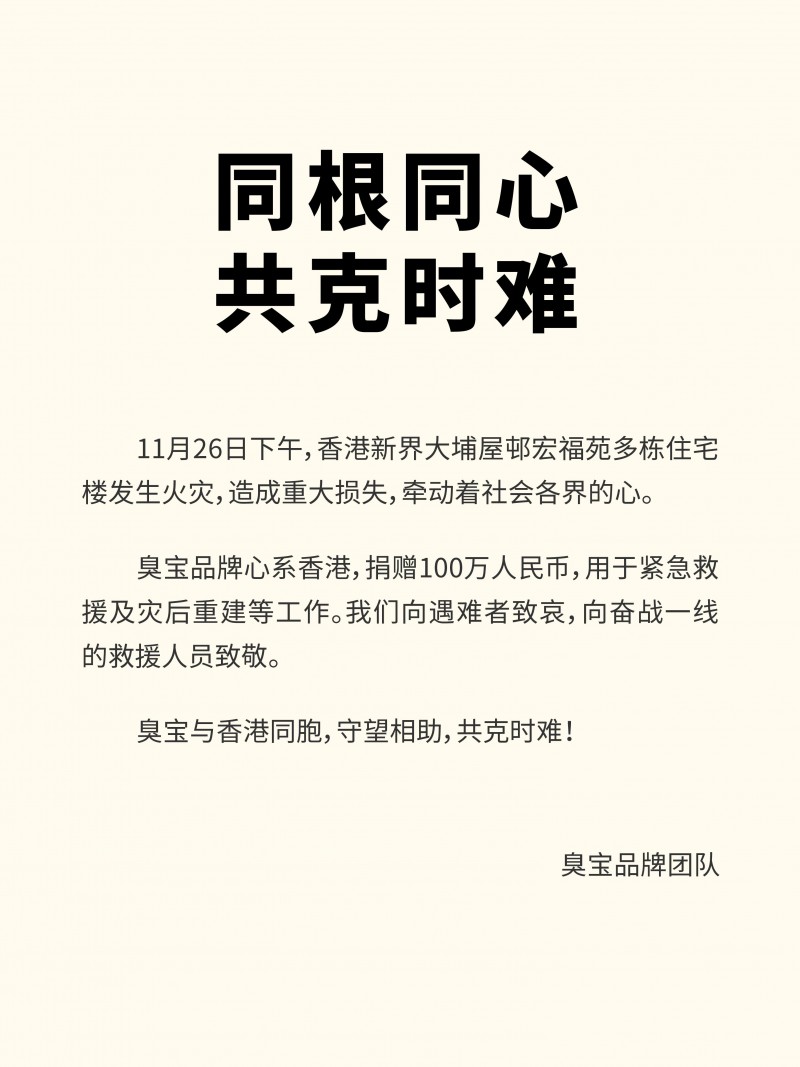 近日,香港新界大埔宏福苑发生五级火灾,灾情严峻,牵动社会各界。 臭宝品牌宣布捐赠100万元人民币驰援香港,用于受灾群众的照顾看护、应急阶段的生活补助以及灾后 老旧社区的减防灾能力提升等各项工作,并向遇难者致哀,向奋战一线的救援人员致敬。 臭宝品牌将持续关注灾情进展,与香港市民共克时艰,支持香港社区建设,早日重建家园。 ...