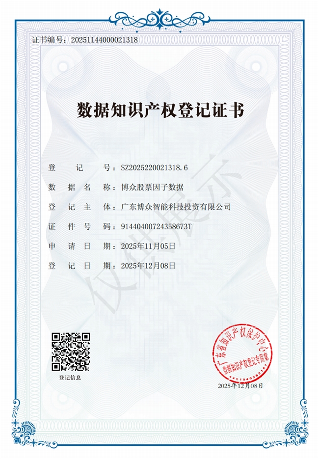 近日,广东博众智能科技有限公司(以下简称"广东博众")捷报频传,接连获得两项数据知识产权登记证 书,彰显了公司在金融科技领域的技术创新实力与数据资产运营能力。 2025年12月8日,广东博众研发的"博众股票因子数据"率先通过广东省知识产权保护中心审核,成功拿 下公司首张数据知识产权登记证书,迈出了数据资产化发展的里程碑式一步。该成果依托文本分析、机 器学习等多维度技术手段,经过多轮数据清洗、特征提取与优化,构建起高质量数据集,为量化策略模 型训练筑牢了核心根基,也为公司"技术+数据"双轮驱动的发展模式奠定了坚实基础。 时隔一个多月,2026年1月21日,广东博众再添佳绩,投研策略风格评价数据-"选股策略风险与收益评 价数据"顺利通过权威审核,再度荣获数据知识产权登记证书。相较于首个成果,该数据产品进一步升 级技术应用,融合文本分析、机器学习、深度学习等多维度前沿技术,聚焦选股策略的风险管控与收益 评估,能够为量化投研提供更精准、更全面的数据支撑,助力策略优化与风险规避。 广东博众短期内两度荣获该类证书,既是对公司数据研发能力、技术创新水平的高度认可,也是企业深 耕数据资产运营、践行"技术创新引领、数据资产核心 ...