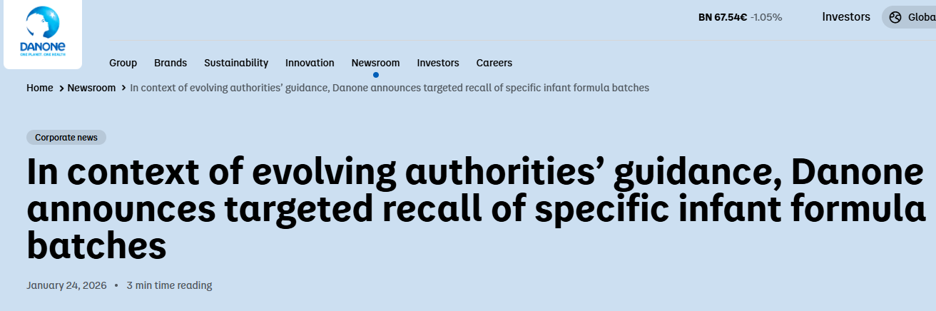北京时间1月24日凌晨,法国达能公司官网发布预防性召回信息显示,达能遵循欧洲地区最新指导意见,在部分市场召回数量极为有限的特定批次婴幼儿配 方产品。 达能中国1月25日回复新京报记者称,达能所有婴幼儿配方奶粉均严格按照高标准生产,并在出厂前经过严苛检测。这些举措可确保产品安全,且符合相关 法规的要求。此次在部分市场启动的预防性召回是依据欧洲主管部门近日的调整意见,产品数量极为有限,且相关产品并未通过官方渠道进入中国市场。换 言之,此次召回的触发因素并非食品安全问题,而是企业在监管要求变化下所采取的预防性措施。 根据英国食品标准局信息,达能此次召回与蜡样芽孢杆菌毒素有关。最近一个月内,欧洲三大乳业巨头——雀巢、拉克塔利斯和达能相继卷入这一风波。 北京时间1月24日凌晨,达能官网发布预防性召回公告。 达能官网截图 涉事产品未引进中国市场 达能召回公告显示,"考虑到当下行业现状,部分地区的食品安全监管机构正在调整相应的指导意见。在此背景下,作为一家负责任的生产企业,达能遵循 最新指导意见,在部分市场召回数量极为有限的特定批次婴幼儿配方产品。" 达能强调,此次召回是预防性措施,无论是日常监控措施,还是基于当前行业特殊 ...