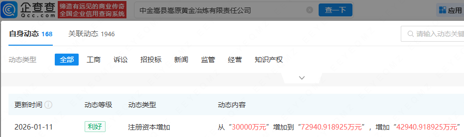 企查查显示,中金嵩县嵩原黄金冶炼有限责任公司成立于2008年12月,法定代表人为张建元,由中金黄金(600489)全资持股。 据悉,近日黄金大涨,中金黄金曾发布公告提示股票交易异常波动情形。 | 个查查 缔造有远见的商业传奇 | Qcc.com 全国企业信用查询系统 | | 中全高层原黄金冷冻有限责任公司 | | | | | (x) 查一下 | | 十 应用 | | --- | --- | --- | --- | --- | --- | --- | --- | --- | --- | --- | | 自身动态 168 | 关联动态 1946 | | | | | | | | Q 请输入动态关键 | | | 动态类型 | रूफ़ी | 工商 | 招投标 | 新闻 | 監 | 经营 | 知识产权 | | | | | | | | | | | | | V | | | | 更新时间(1) | | 动态等级 | 动态类型 | | | 动态内容 | | | | | | 2026-01-11 | | 利好 | 注册资本增加 | | | | | 从"30000万元"增加到"72940.918925万元",增加"42940.91 ...