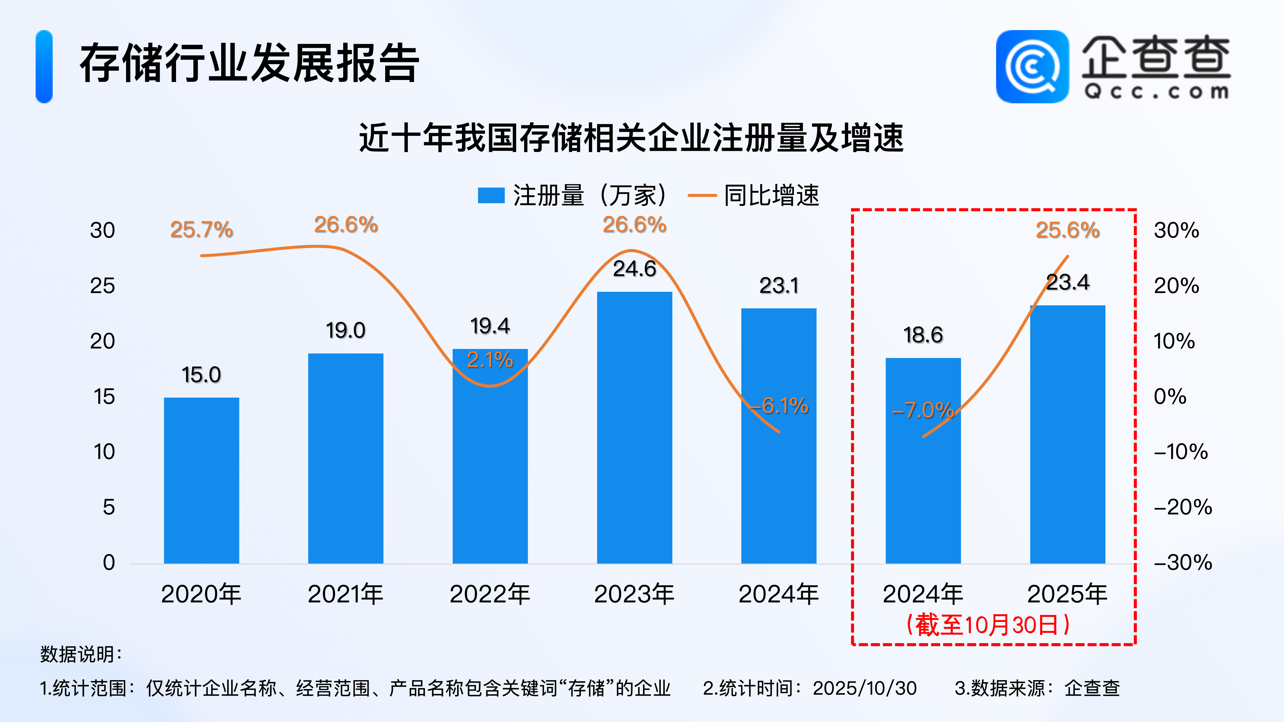 Core Insights - Samsung Electronics, the world's largest memory chip manufacturer, reported a 19% quarter-over-quarter sales increase in its chip business for Q3, driven by strong demand in the artificial intelligence sector, with its memory chip sales reaching a historical high [1] - Samsung's HBM3E has recently been certified by NVIDIA, and the company is now targeting mass production of HBM4 to catch up with SK Hynix's 73% market share, indicating an intensifying competition in the storage industry [1] - The price of memory modules has doubled in the past month in Hangzhou, China, with consumers comparing the rising prices to that of gold, highlighting the current market dynamics [1] Industry Registration Data - As of October 30, 2025, China has registered 234,000 storage-related enterprises, surpassing the total for 2024 and reflecting a 25.6% increase compared to the same period in 2024 [4] - In 2023, the cumulative registration of storage-related enterprises in China reached 246,000, marking a year-on-year growth of 26.6% and 1.6 times that of 2020 [4] Industry Stock Data - The stock of storage-related enterprises in China has steadily increased, exceeding 1.2 million as of October 30, 2025, with a total of 1.205 million [7] - The number of storage-related enterprises in China first surpassed 500,000 in 2020 and 1 million in 2024 [7] Regional Distribution - The majority of storage-related enterprises in China are concentrated in the East and South China regions, accounting for a combined 56.6%, with East China alone representing 36.1% [12]