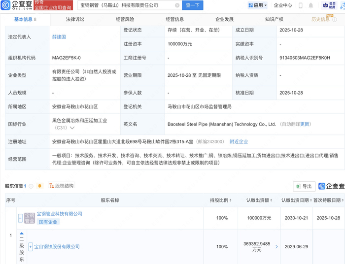 企查查APP显示,近日,宝钢钢管(马鞍山)科技有限责任公司成立,法定代表人为薛建国,注册资本 10亿人民币,经营范围包括钢、铁冶炼,钢压延加工,货物进出口等。企查查股权穿透显示,该公司由 宝钢管业科技有限公司全资持股,后者为宝钢股份(600019)全资子公司。 | 全国企业信用查询 | | 宝钢钢管(马鞍山)科技有限责任公司 | 8 责一下 | 脂 应用 - | 企业中心 0 10 | 12 25 0 | | --- | --- | --- | --- | --- | --- | --- | | 基本信息 8 | 法律诉讼 | 经营风险 | 经营信息 企业发展 | | 知识产权 | 历史信 | | 法定代表人 | 薛建国 | 登记状态 | 存续(在营、开业、在册) | 成立日期 | 2025-10-28 | | | | | 注册资本 | 100000万元 | 实缴资本 | | | | 组织机构代码 | MAG2EF5K-0 | 工商注册号 | | 纳税人识别号 | 91340503MAG2EF5K0H | | | 企业类型 | 有限责任公司(非自然人投资或 控股的法人独资) | 营业期限 | 2025-10- ...