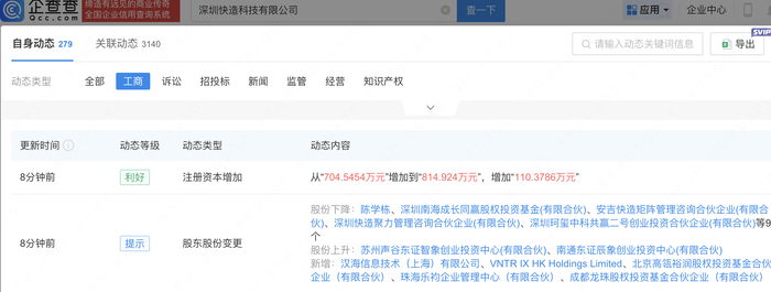 企查查APP显示,近日,深圳快造科技有限公司发生工商变更,新增美团关联公司汉海信息技术(上 海)有限公司、成都龙珠股权投资基金合伙企业(有限合伙)等为股东,同时注册资本增至814.92万 元。企查查信息显示,该公司成立于2016年,法定代表人为陈学栋,经营范围包含:机器人、自动化设 备、机电产品、电子产品、电源产品、塑料制品、金属制品、计算机软硬件和检测设备的研发等。公开 信息显示,快造科技是一家集研发、生产和销售桌面级多功能3D打印机公司。 | | 原植花园的变情感 全国企业信用查询系统 | 深圳快造科技有限公司 | | | (X) | 货一下 | | 脂 应用 ~ | | 企业中心 | | | --- | --- | --- | --- | --- | --- | --- | --- | --- | --- | --- | --- | | 自身动态 279 | 关联动态 3140 | | | | | | | | Q 请输入动态关键词信息 | SVIP ■ 合品 | | | 动态类型 | 手脚 工商 山平公 | 招投标 新闻 | 监管 | 经营 | 知识产权 | | | | | | | | 更新时间(1) ...