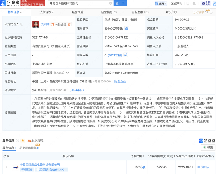 | | 中芯国际控股有限公司 0 音一下 ■ 应用 · 企业中心 0.0 | | | | | Q | | --- | --- | --- | --- | --- | --- | --- | | 基本信息 76 | 法律诉讼 2 经营信息 23 知识产权 | 经营风险 | 企业发展 436 | | 历史信息 | | | 法定代表人 1 | 存续(在营、开业、在册) 刘训峰 【益关联企业 17 | 登记状态 | | 成立日期 | 2015-07-28 | | | | 595000万美元 益 | 特照是共 | | 实验资本 | 445000万美元 1 | | | 组织机构代码 | 32217746-6 310000400776126 | 工商注册号 | | 纳税人识别号 | 913100003221774669 | | | 非而常感 | 有限责任公司(外国法人独资) 2015-07-28 至 2065-07-27 | 营业期限 | | 纳税人资质 | 一般纳税人 | | | 人员规模 | 0 (2024年报) 血 | 参保人数 | | 核准日期 | 2025-10-28 | | | 所属地区 | 上海市浦东所区 上 ...