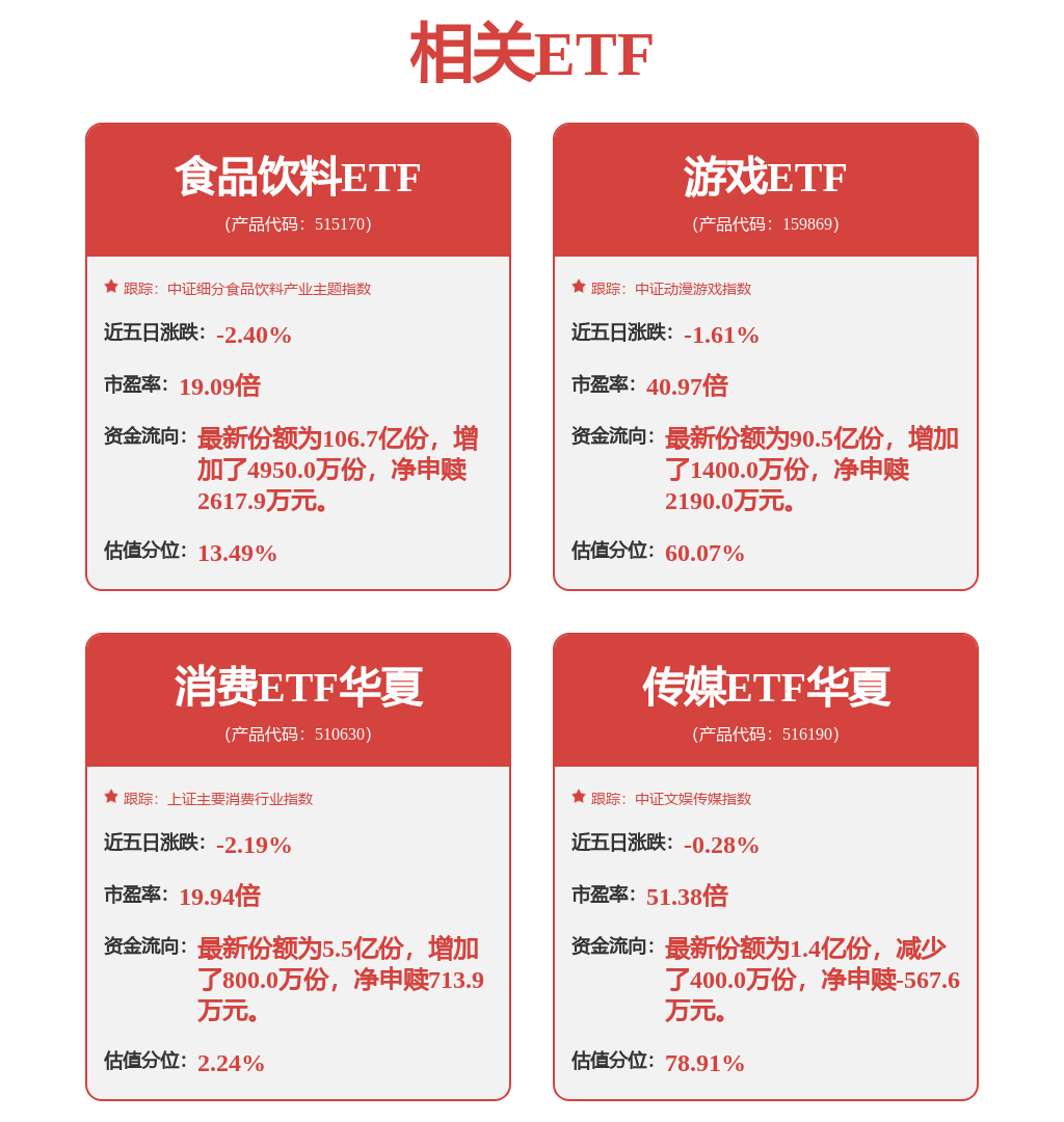 (原标题:光线传媒等成立文化科技公司) 企查查APP显示,近日,北京一刻光文化科技有限公司成立,法定代表人为邢嘉芸,经营范围包含:电影摄制服务;广播电视节目制作经营;电 视剧发行;互联网直播技术服务:电影发行;出版物零售等。企查查股权穿透显示,该公司由光线传媒(300251)全资子公司北京光线影业有限 公司、余志刚共同持股。 相关ETF 食品饮料ETF (产品代码: 515170) ★ 跟踪:中证细分食品饮料产业主题指数 近五日涨跌: -2.40% 市盈率: 19.09倍 资金流向: 最新份额为106.7亿份, 增 加了4950.0万份,净申赎 2617.9 可元。 估值分位:13.49% 游戏ETF (产品代码:159869) ★ 跟踪:中证动漫游戏指数 近五日涨跌: -1.61% 市盈率: 40.97倍 资金流向: 最新份额为90.5亿份,增加 了1400.0万份,净申赎 2190.0万元。 估值分位: 60.07% 消费ETF华夏 (产品代码: 510630) ★ 跟踪:上证主要消费行业指数 资金流向: 最新份额为1.4亿份, 减少 了400.0万份,净申赎-567.6 万元。 估值分位: 78.91% ...