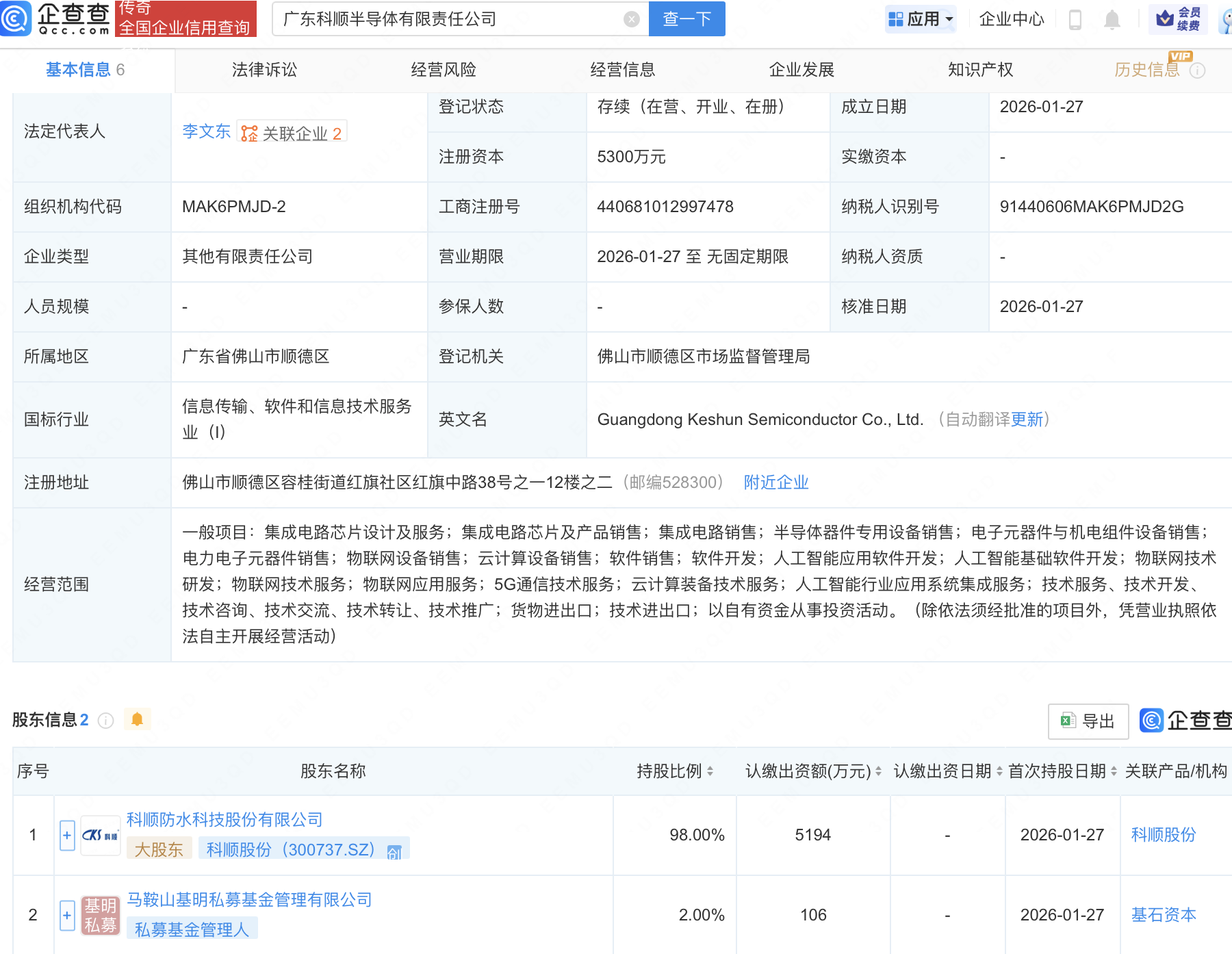 | 序号 | | | 股东名称 | 持股比例 ⇒ | | --- | --- | --- | --- | --- | | | + | CKS BIN | 科顺防水科技股份有限公司 | 98.00% | | | | | 科顺股份(300737.SZ) 国 大股东 | | | 2 | | 基明 | 马鞍山基明私募基金管理有限公司 | 2.00% | | | | 私募 | 私募基金管理人 | | 企查查APP显示,近日,广东科顺半导体有限责任公司成立,注册资本5300万元,经营范围包含:集成电路芯片及产品销售;半导体器件专用设备销售;人 工智能应用软件开发;人工智能基础软件开发;物联网技术研发等。企查查股权穿透显示,该公司由科顺股份(300737)等共同持股。 | 上一篇 全国企业信用查询 | 东科顺半导体有限责任公司 | | ×) 查一下 | | --- | --- | --- | --- | | 基本信息 6 | 法律诉讼 | 经营风险 | 经营信息 | | 法定代表人 | 李文东 | 登记状态 | 存续(在营、开业、? | | | | 注册资本 | 5300万元 | | 组织机构代码 | MAK6PMJD-2 ...